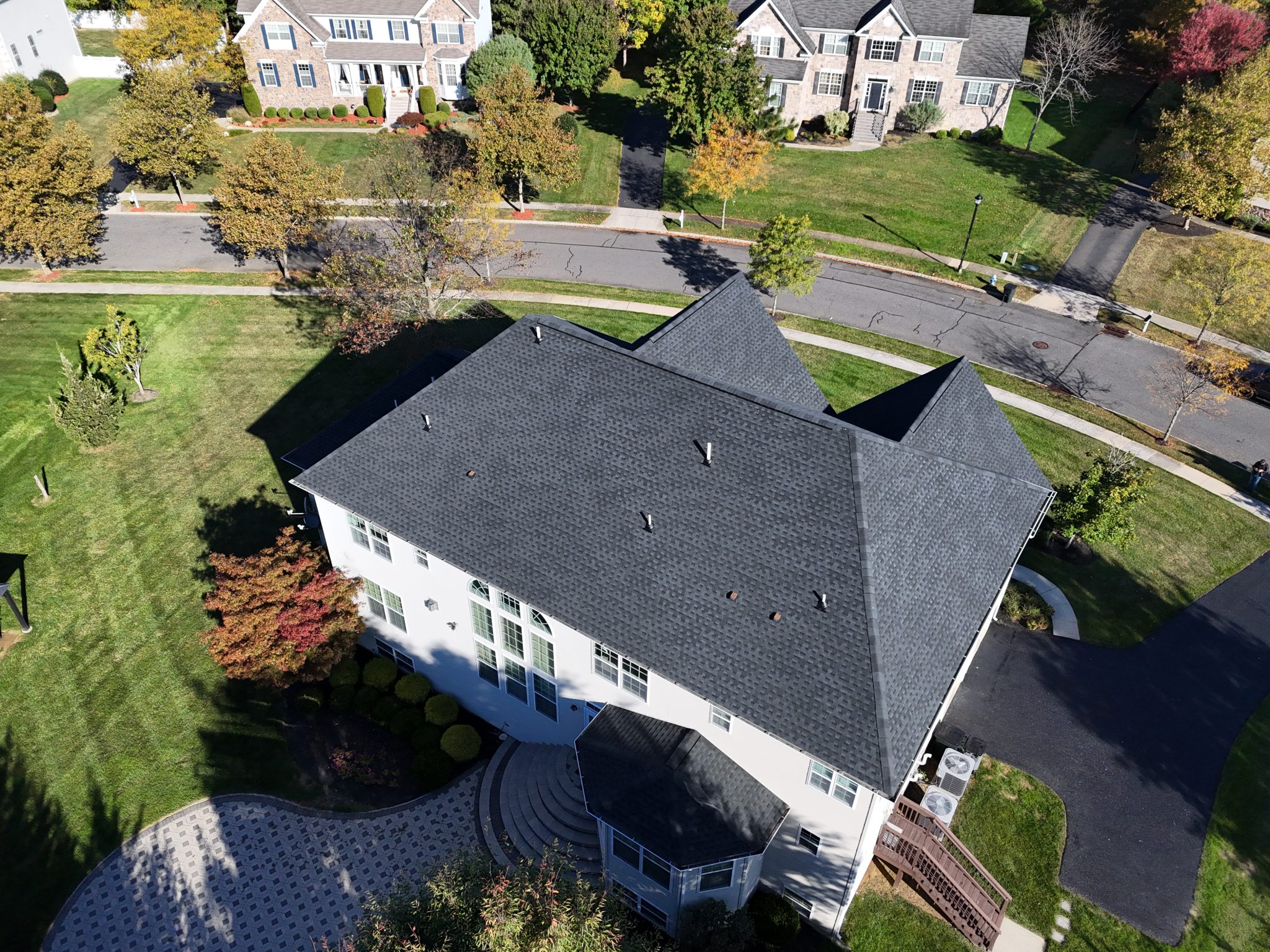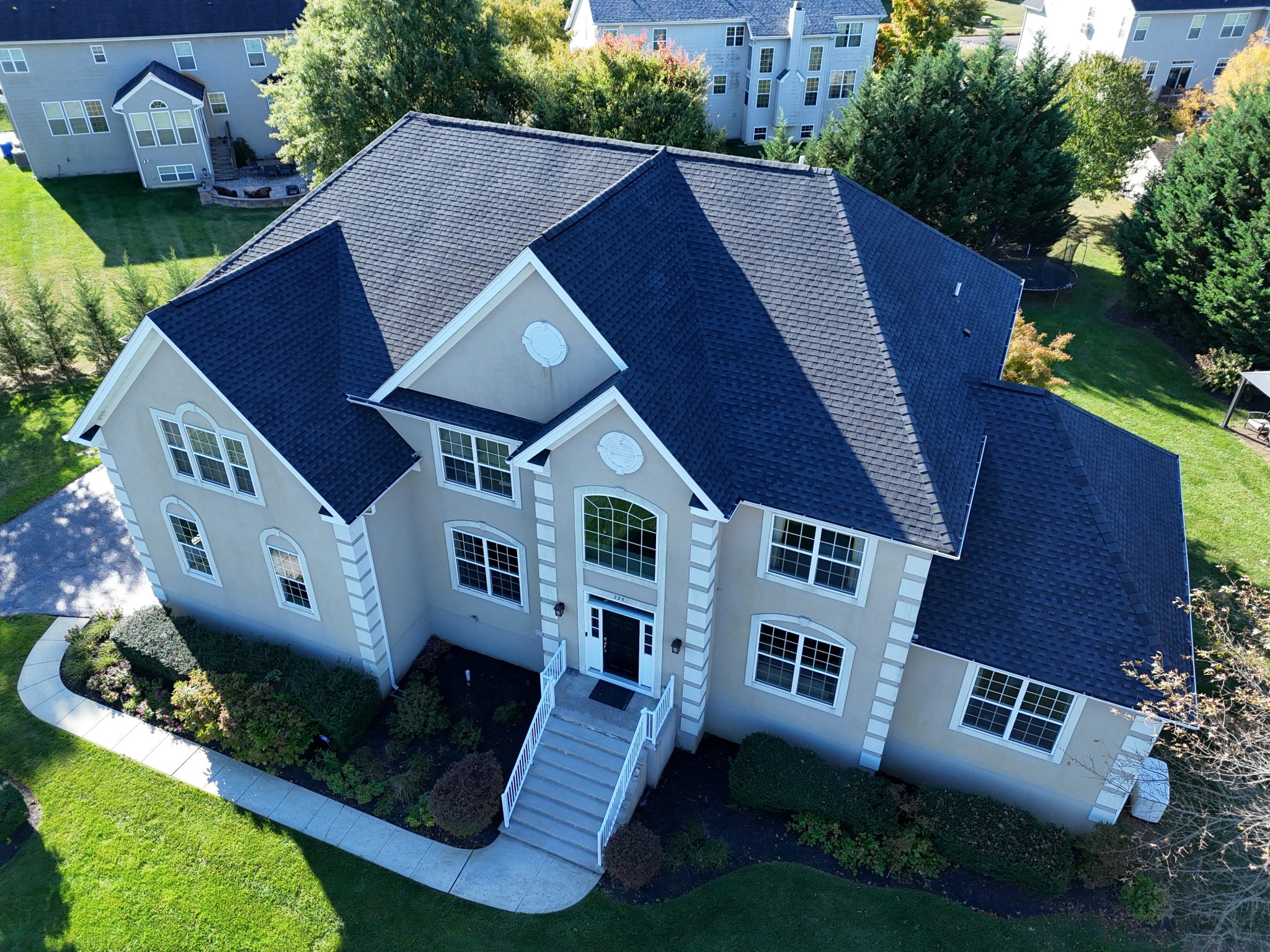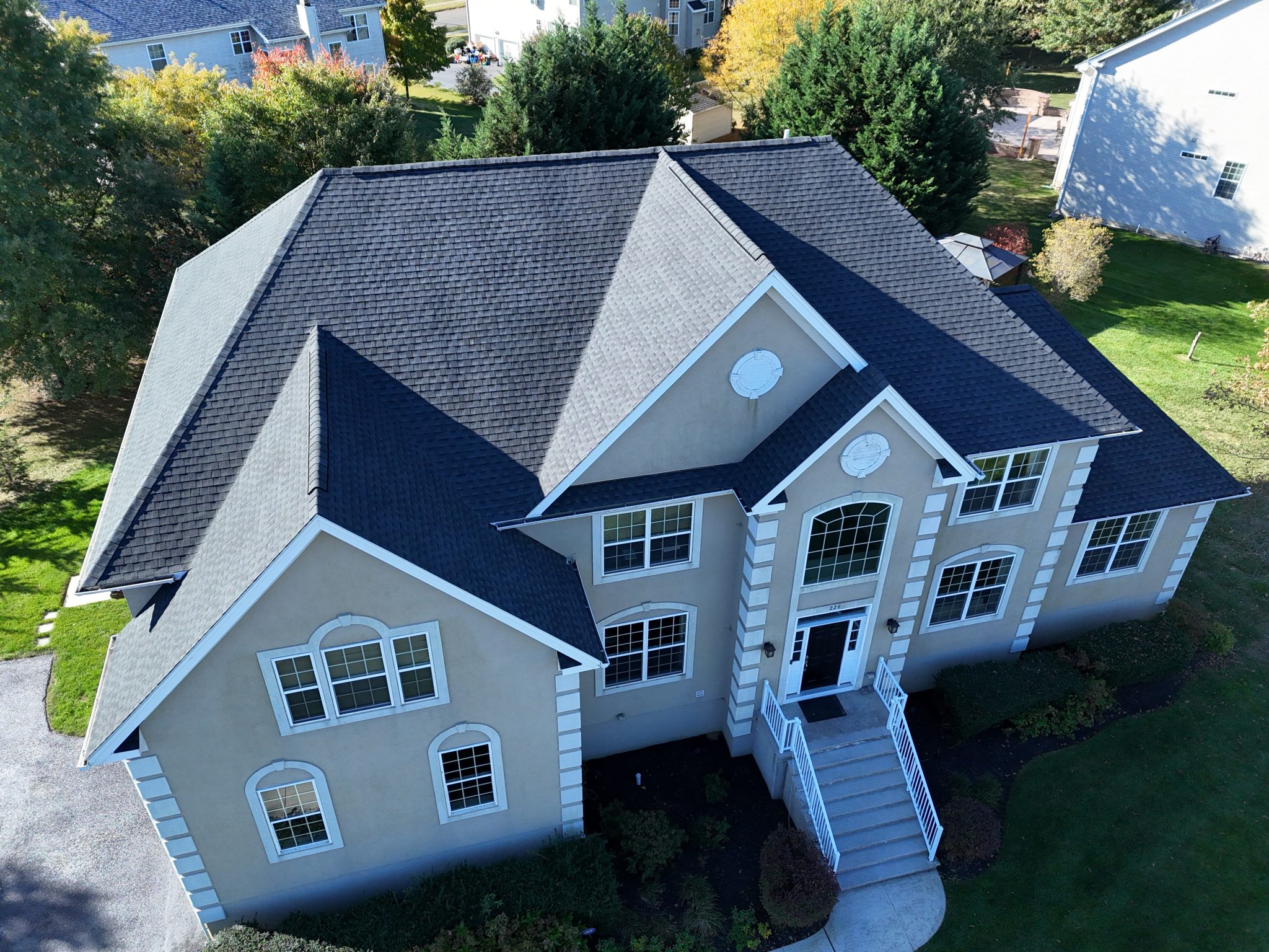 We designed a comprehensive roofing replacement using premium asphalt shingles in a sophisticated charcoal shade that perfectly complements the home’s stucco exterior and white trim details. The darker color choice adds depth and dimension to the complex roofline while providing a timeless, upscale appearance. These high-grade shingles offer exceptional durability, superior wind resistance, and excellent weather protection suitable for New Jersey’s demanding climate. Our installation strategy addressed the technical challenges posed by the home’s architecture, ensuring proper water management across multiple roof valleys and transitions. We incorporated advanced underlayment systems, strategic ventilation to prevent moisture accumulation and heat buildup, and precision flashing at all critical junctions. Every dormer, gable, and roof intersection received specialized attention to guarantee watertight integrity and long-term performance.