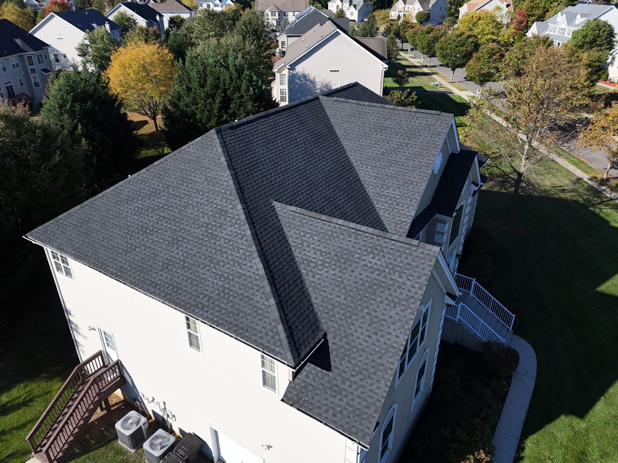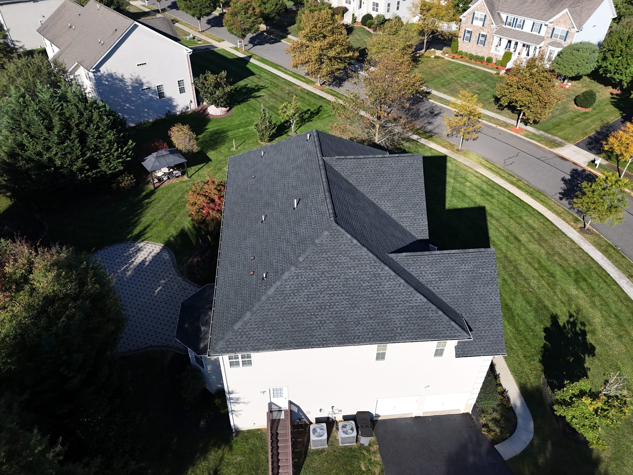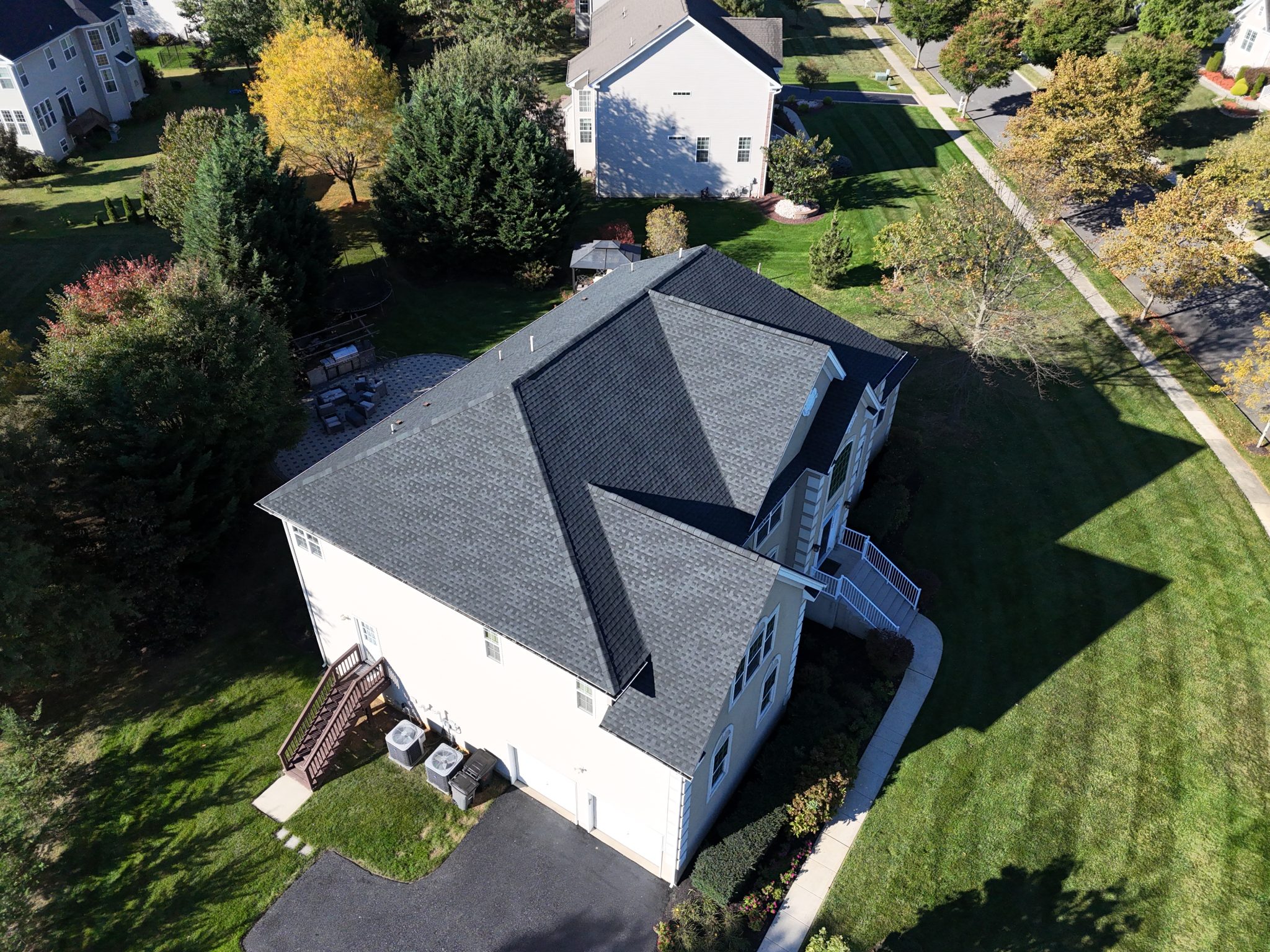 We designed a comprehensive roofing replacement using premium asphalt shingles in a sophisticated charcoal shade that perfectly complements the home’s stucco exterior and white trim details. The darker color choice adds depth and dimension to the complex roofline while providing a timeless, upscale appearance. These high-grade shingles offer exceptional durability, superior wind resistance, and excellent weather protection suitable for New Jersey’s demanding climate. Our installation strategy addressed the technical challenges posed by the home’s architecture, ensuring proper water management across multiple roof valleys and transitions. We incorporated advanced underlayment systems, strategic ventilation to prevent moisture accumulation and heat buildup, and precision flashing at all critical junctions. Every dormer, gable, and roof intersection received specialized attention to guarantee watertight integrity and long-term performance.